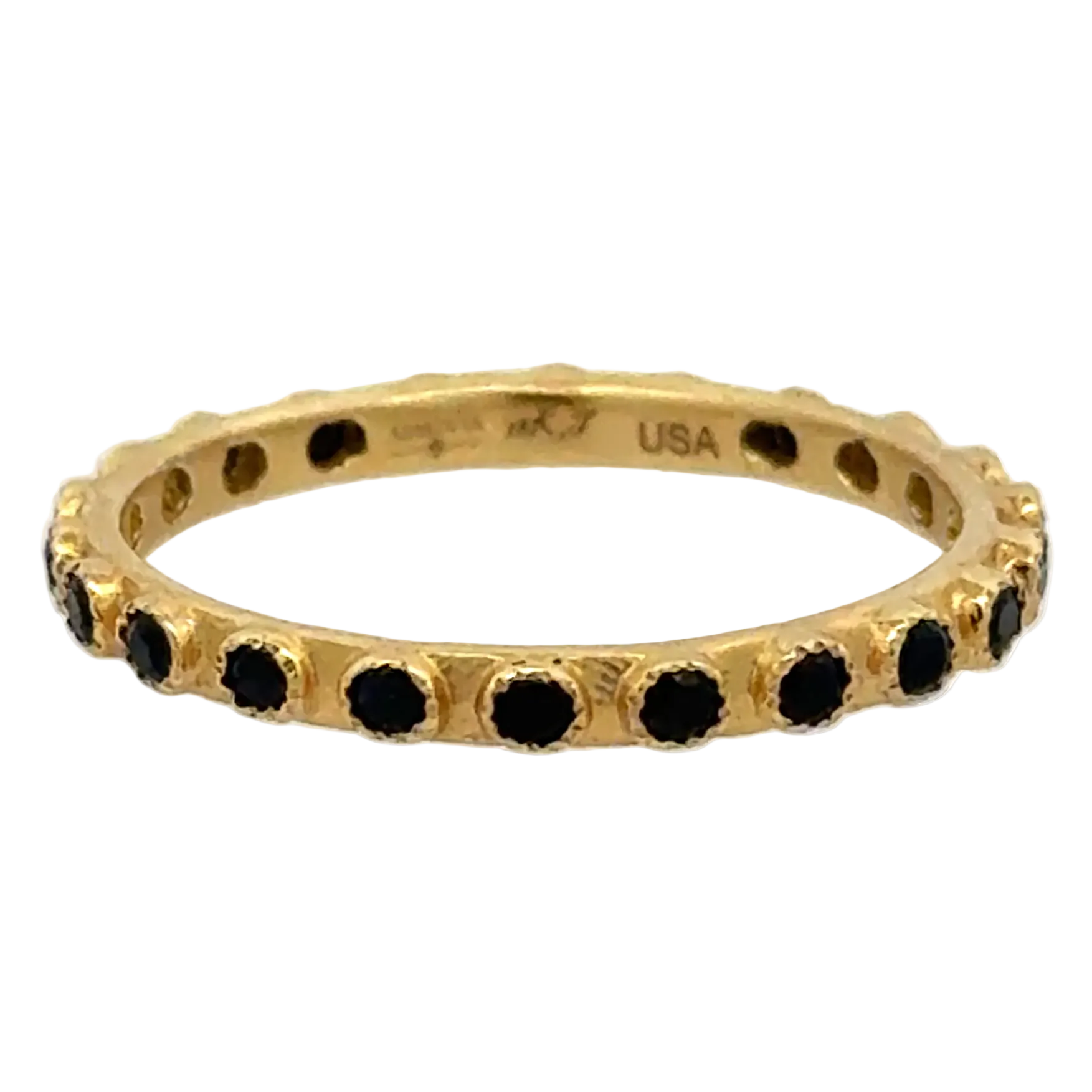 Discover refined sophistication with this stunning 18k Sueno yellow gold ring by Armenta, size 8. Black sapphire stations create a captivating visual rhythm along the band, offering timeless elegance for any occasion. The versatile design pairs beautifully with complementary pieces, making it an ideal choice for stacking with other rings to craft your own personalized luxury collection.