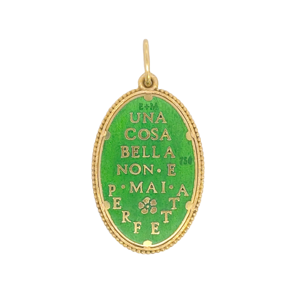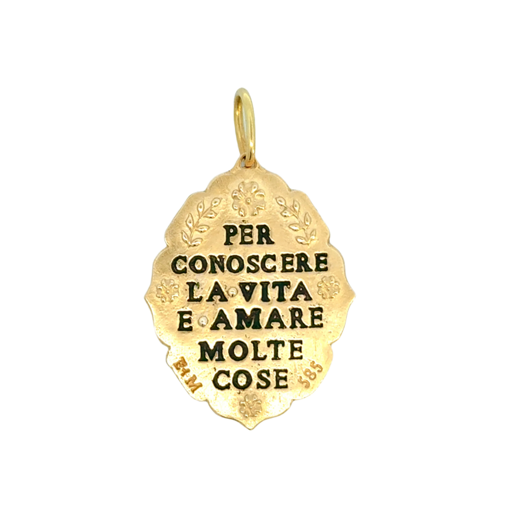 Erica Molinari melds beloved motifs from the past with a modern and soulful sensibility, creating pieces that embody an old-world charm with a contemporary presence and character. Since 2005, her silver and 18K gold charms have been double-sided with motifs and sayings in Latin or Italian, and all evoke sentiments and mottos that are utterly relatable and hit a responsive chord with symbolic and meaningful messages.