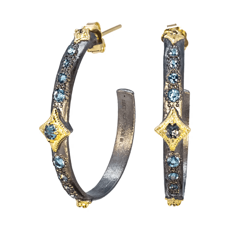 Add a pop of color to your look with these edgy 30mm London Blue Topaz Crivelli Hoops. These hoop earrings feature hand-cut London blue topaz stones set in 18k yellow gold and sterling silver. Armenta's signature crivelli design adds a unique touch to these stunning earrings.