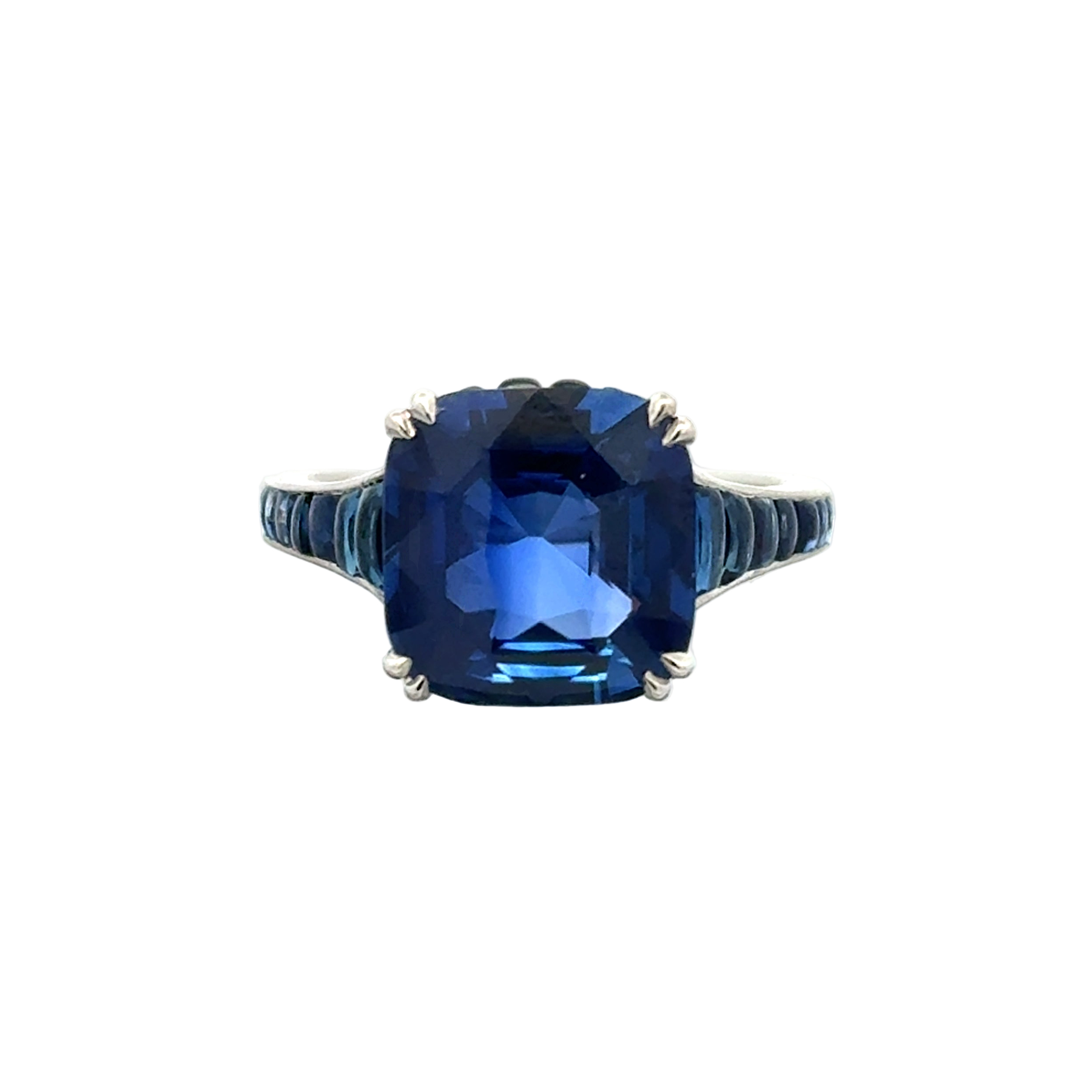 This Magnolia Collection ring captures timeless elegance with a commanding 5.07-carat Ceylon blue sapphire, expertly cut in cushion form to showcase its rich, velvety depths. The center stone is gracefully accompanied by 1.55 carats of French-cut blue sapphires set along the sides, creating a harmonious design that amplifies its brilliance. Crafted in platinum and sized at 6.5, this ring represents the ultimate expression of sophisticated luxury and enduring beauty.