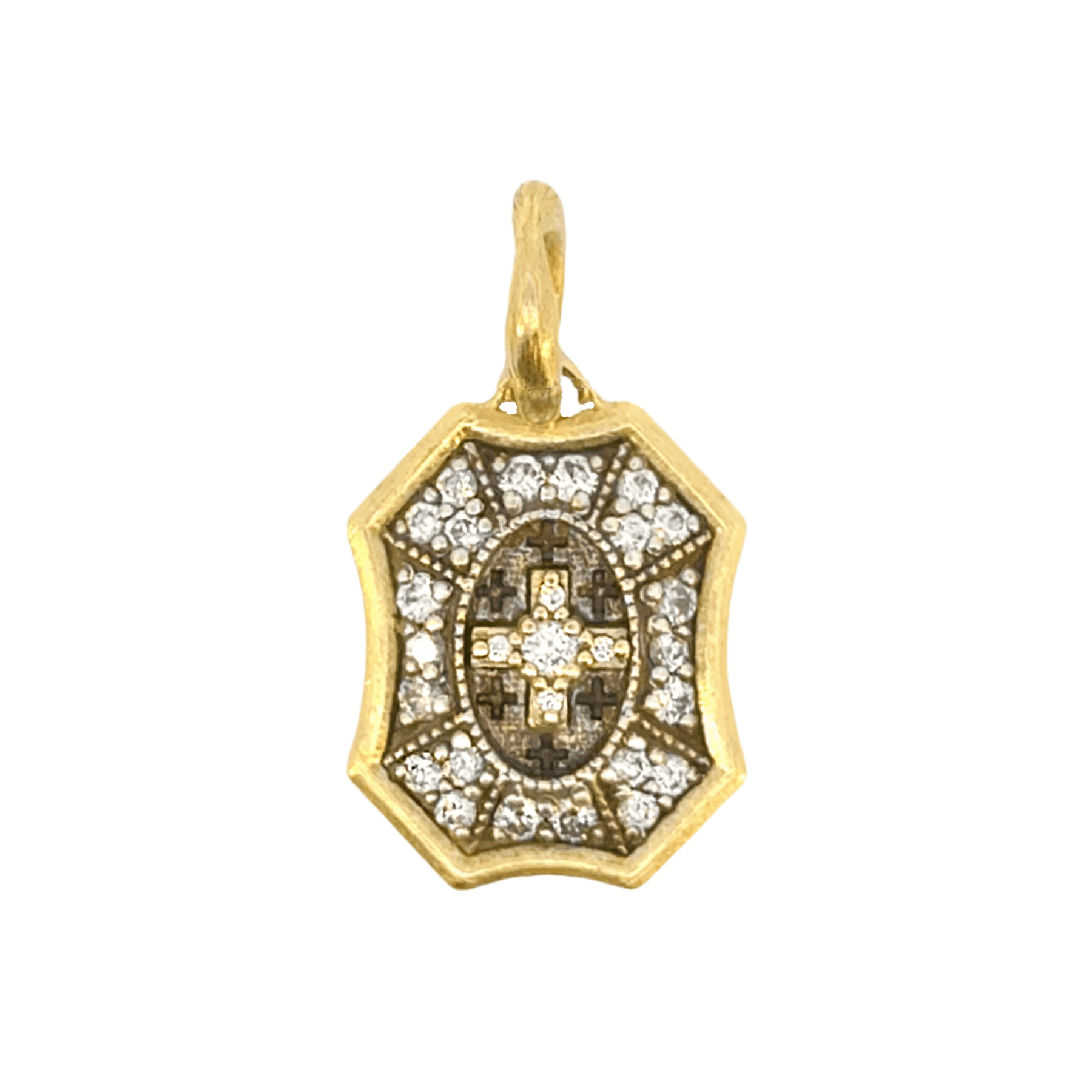 Add some sparkle and sentiment to your jewelry collection with the Baby Cross Shield Charm by designer Erica Molinari. This charm features .44 carats of diamonds, set in a unique combination of 18k yellow gold and sterling silver. And with the sweet phrase "Do Not Forget Me" engraved on the back, it serves as a lovely reminder to cherish every moment.