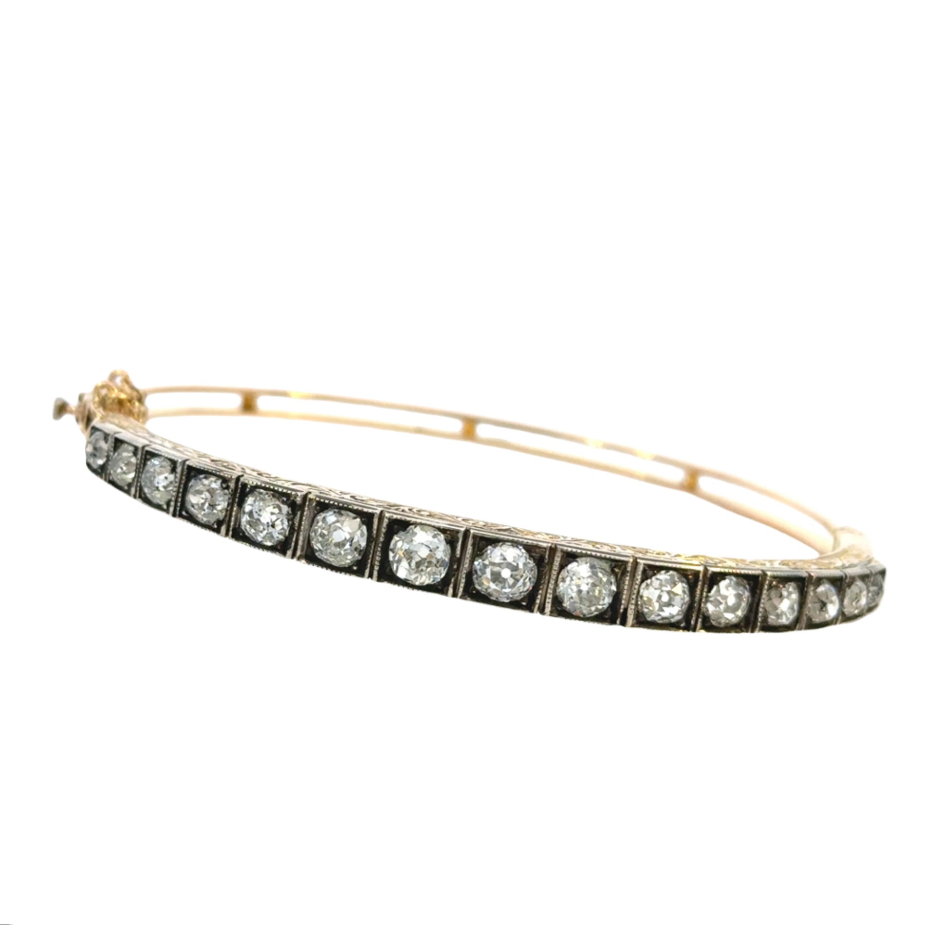 Upgrade your wrist game with our Vintage Diamond Bangle from the Magnolia Collection. Crafted from 15k yellow gold and sterling silver, this bangle features 4 carats of sparkling diamonds. A timeless piece with a touch of modern elegance. Shine on, darling!