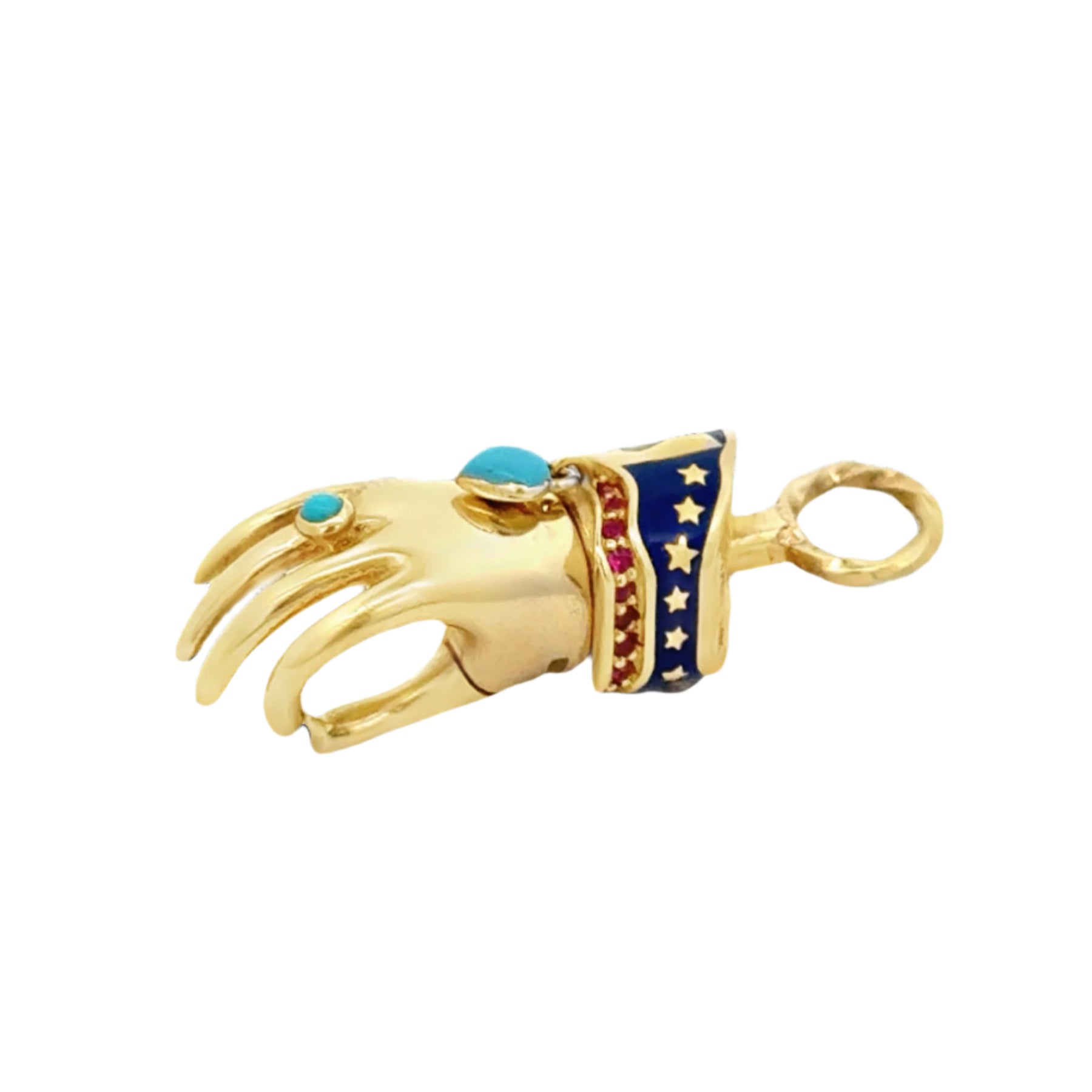The Love and Luck Mechanical Hand Clasp from Circa 1700 is crafted in luminous 14k yellow gold with blue enamel and features a delicate ace of spades playing card. Adorned with vibrant ruby and turquoise accents, this luxurious piece blends classic symbolism with exquisite craftsmanship, making it a captivating statement of style and fortune.