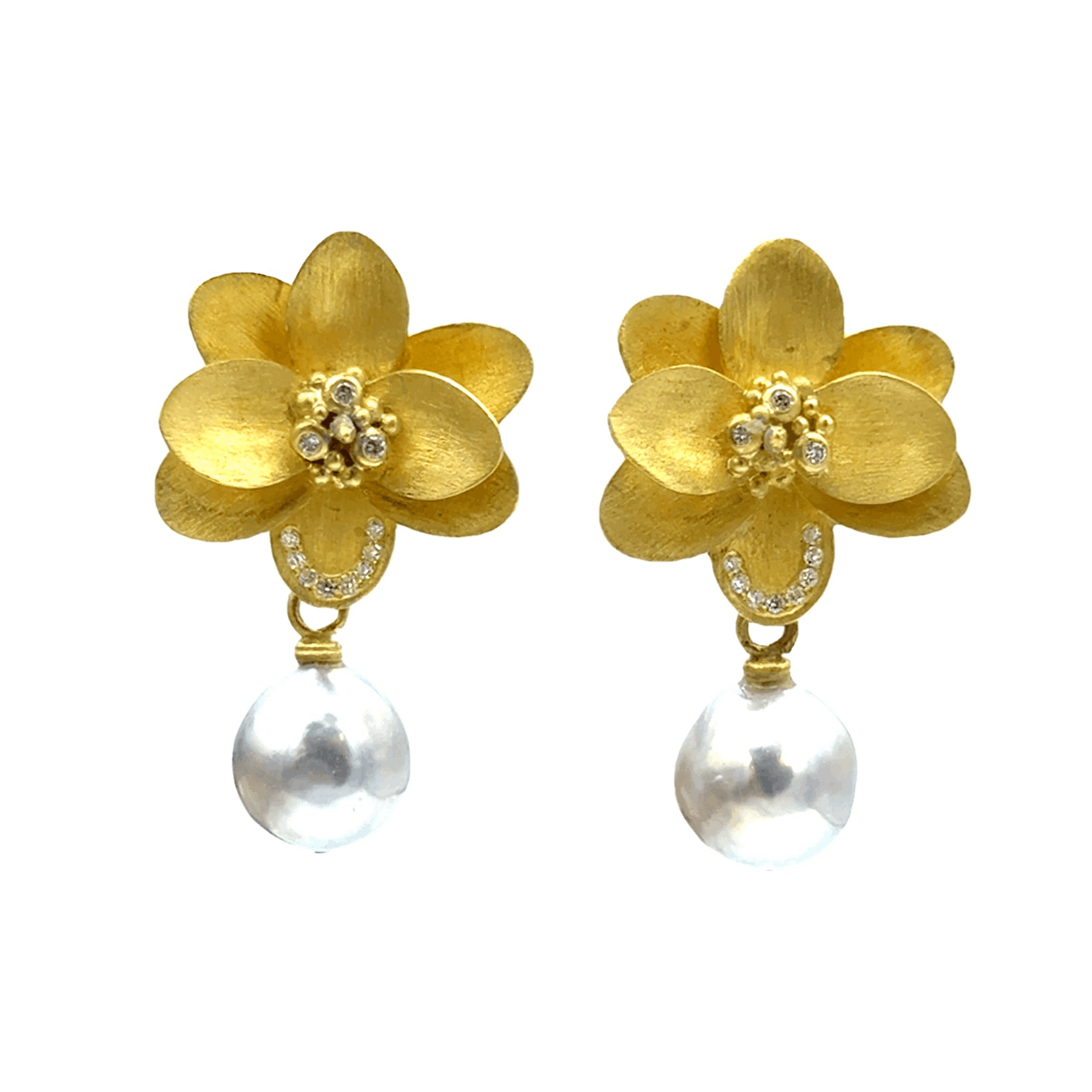 Enhance your style with these playful and exclusive Akoya Pearl Magnolia Earrings. Made with 18k yellow gold and adorned with .22 carat diamonds, these earrings feature one-of-a-kind Magnolia flower pieces designed by Lene Vibe exclusively at Magnolia City Jewelers. Bring a touch of timeless elegance to any outfit.