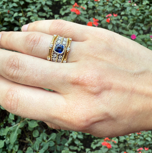 This exquisite Sapphire Ring from the Magnolia Collection features a brilliant .97 carat blue sapphire centerpiece set in premium 18k yellow gold. Delicate .14 carat diamond accents enhance its captivating elegance, creating a timeless statement piece. Designed in size 6, this ring combines luxury and refined craftsmanship, perfect for those seeking enduring beauty and sophistication.