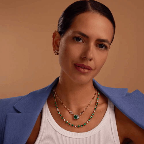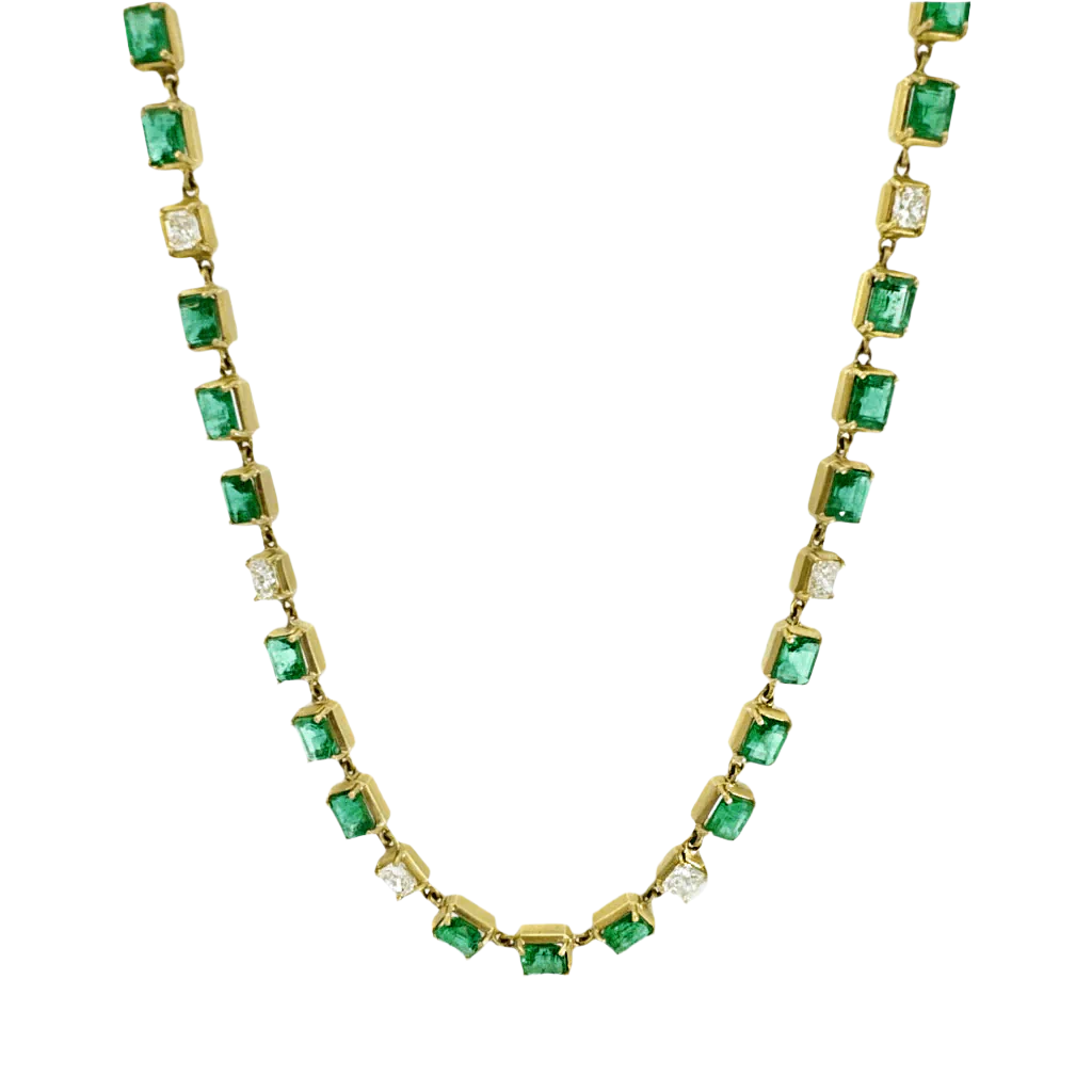Elevate your elegance with the Emerald Riviera Necklace, featuring radiant 15.60 carat Zambian emeralds accented by sparkling 3.14 carat diamonds. Crafted in lustrous 18k yellow gold and designed by Sylva & Cie, this 18-inch masterpiece exudes timeless luxury and refined sophistication. Perfect for making a statement at any special occasion.