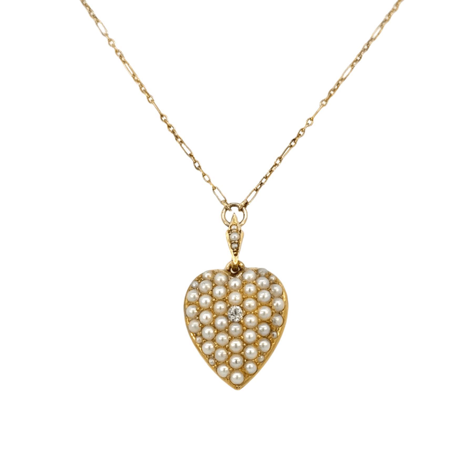 Unlock a timeless treasure with our Vintage Pearl Heart Locket from the Magnolia Collection. Crafted from 14k yellow gold, this heart-shaped locket features a sparkling center diamond and 15 carat pearls. Complete with a 7.5" chain and a special engraving of March 19th 1904 above the picture on the back, this locket is a lovely addition for any occasion!