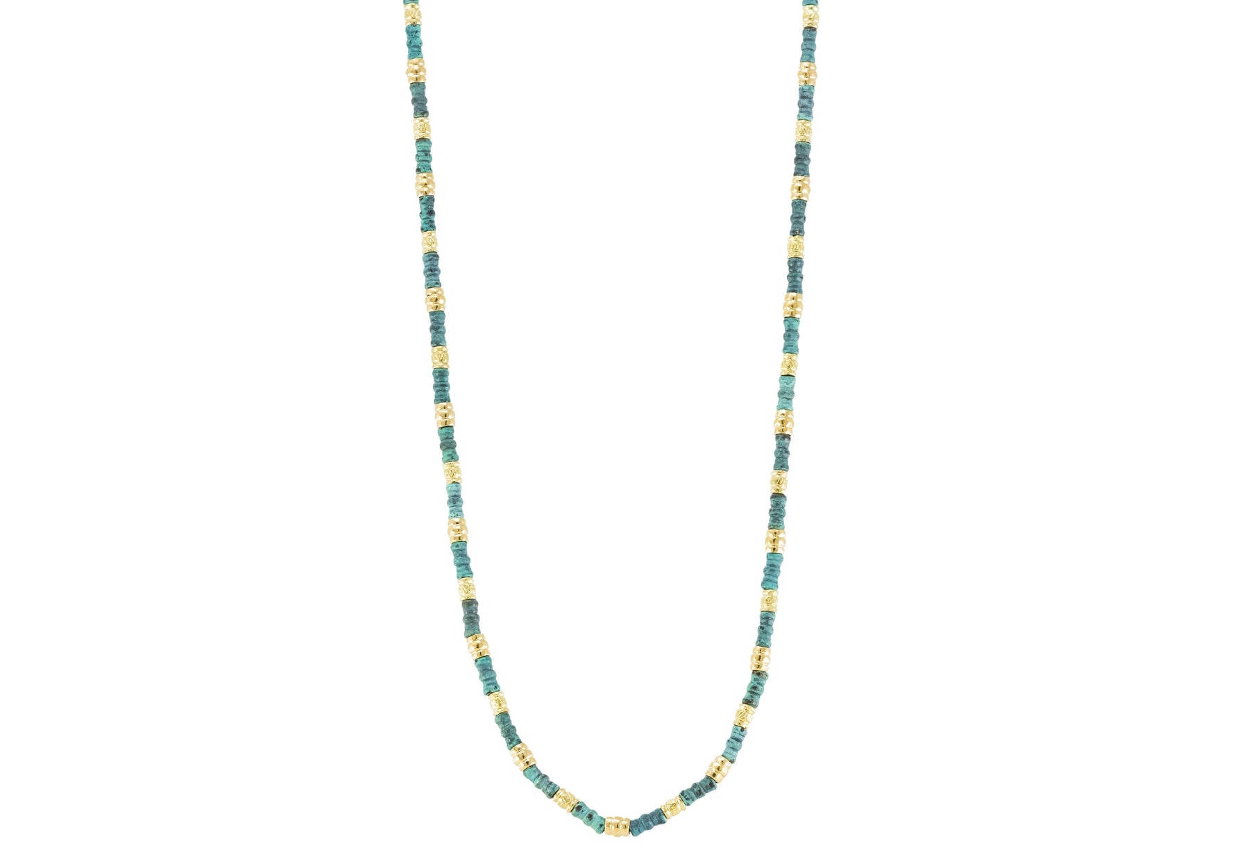 Upgrade your style with the Artifact Bead Necklace by designer Emily Armenta. Featuring teal patina beads from the Artifact Collection, this necklace can be adjusted to 24", 26", or 28" in length. Crafted with 18k yellow gold and sterling silver, it's the perfect addition to your layered look.